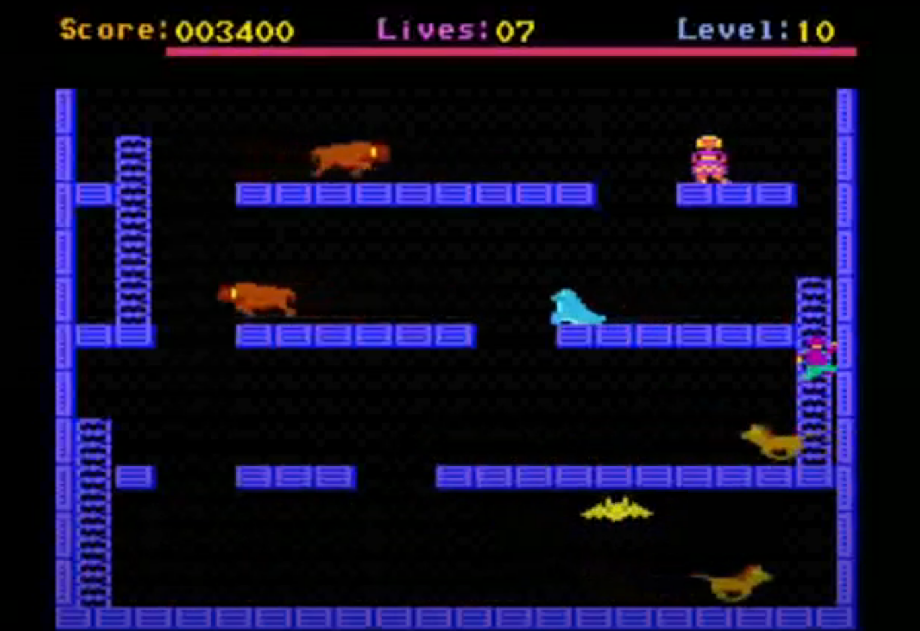 Gameplay: Your goal in Animal Keeper is to keep as many animals as you can inside the walls when the timer runs out. Your Zoologist will run along the edges of the wall, magically rebuilding the broken parts with his magic feet as he goes. The animals within the walls will be breaking it down just as fast as you can fix it, in an attempt to escape and have a nice man- meat meal. Random, magical nets are your only power up, and when you finally grab one, touching an animal with it sends it back inside the walls. CRIME DOESN'T PAY! Animal Keeper is very addictive, and before you know it you've sunk several hours into it and missed your review deadline (sorry Funk). It is slower than Zoo Keeper, which I honestly prefer. AK does not attempt to follow the level design of ZK, and the platforming levels are vastly different. Zoo Keeper's bonus levels are like that terrible jumping mini game from Swordquest Earthworld (Atari 2600), and Animal Keeper's is more like a very basic, single screen Lode Runner (Amiga, Atari XE). To be honest, both are the worst parts of their respective games. But for as much fun as the simple gameplay of the main game is, there are some technical flaws I can't ignore. For one, if you lose all of your lives and choose to continue from where you left off at the menu, the bonus levels go away perminately. This may be a good thing if your not a fan of them, however. The whole game can feel like it's moments from crashing completely, it's jittery and glitchy, although the game has never crashed on me. The screen flashes like crazy as the action suffers slowdown, and then the animals will start behaving oddly. They appear as though they are inside the cage but sudenly snap back to the perimeter unexpectedly. And getting stuck on corners is going to happen. But if you take the good with the bad, I've found that the fun and addictive gameplay trump these issues overall (plus these issues are fairly infrequent).