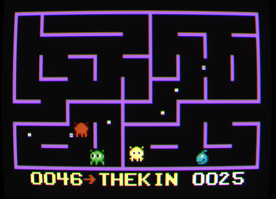 Gameplay: The game is ugly and sounds bad, but gameplay is where KC Munchkin brings the first gen thunder. It is a maze game, but like the ABA was to the NBA, this underdog title brought some fun caveats to the scene. First and foremost, the mazes are smaller, and action tends to get rolling fast. There are only 3 monsters (called munchers) instead of 4, but that's fine. You need to move KC quickly, because the monsters can kill old Munchie within a second. No lie. Get moving, because you only have one life. Yeah, you dumb bastard, you heard right. Quit looking at me with that dumb look on your face and get moving. There's only 12 pills/ dots/ Tic Tacs to eat on the screen, and 4 of those are power pellets, but they all move around the maze. Also, when you die, you can enter your NAME (up to 6 characters) into a high score portion of the screen that can be proudly shown to all of your stuffed animals in your living room for the perpetuity of that game mode. Realizing the game is over and the cartridge wants you to enter your name for a high score is a bit counter intuitive and weird since there are no commands. Games also start over immediately after you die if you do not obtain a high score... which is really odd form. It took me a while to understand that these games were starting over and I wasn't just losing lives. During gameplay, I like how old Munchie can stop on a dime, sizing up the rundown of the maze, whereas Pac Man was always forced to be in motion unless he rammed his face into a wall. There is an option for Invisible maze walls, a level editor, and four different maze options! There's even a random maze option which changes the gameplay from screen to screen.